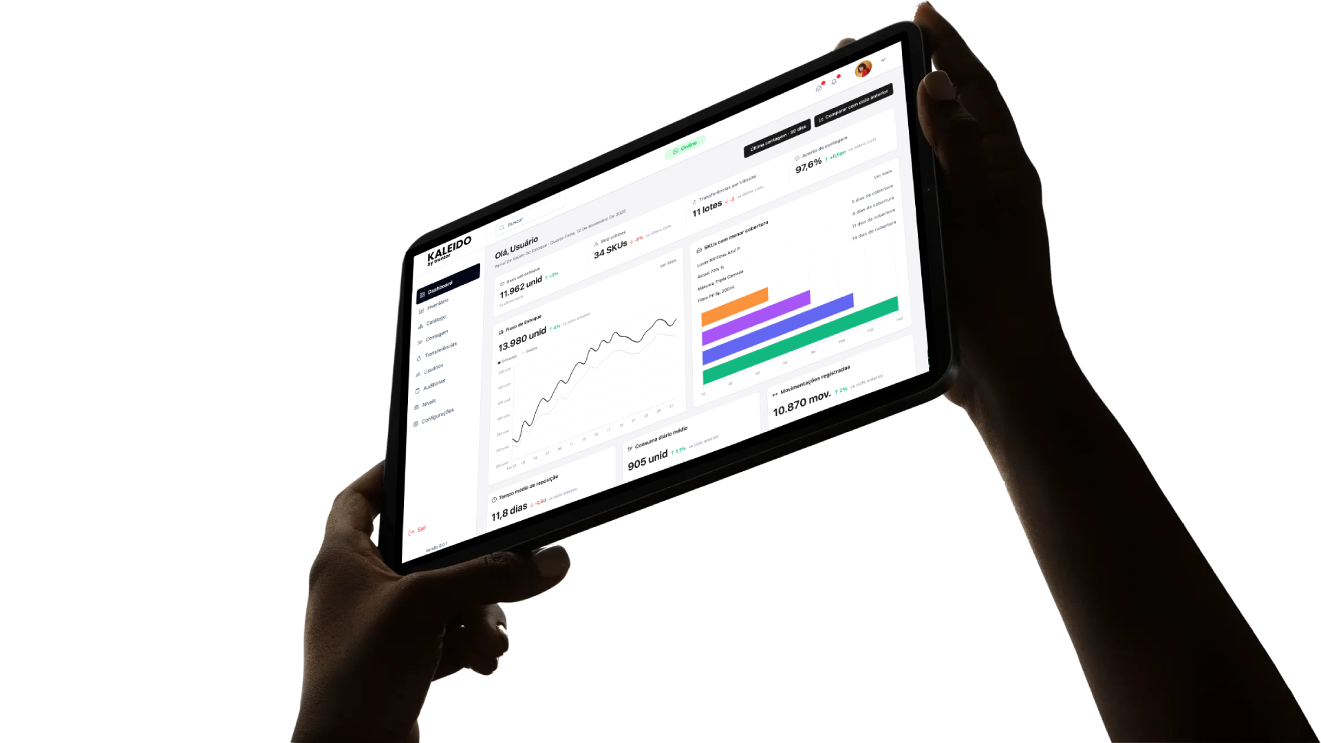 Kaleido é uma plataforma completa de gestão de inventário desenvolvida pela Trentor que permite controlar seu estoque de forma inteligente e eficiente. Com recursos avançados de rastreamento, alertas automáticos e relatórios detalhados, você tem total visibilidade sobre seu inventário.